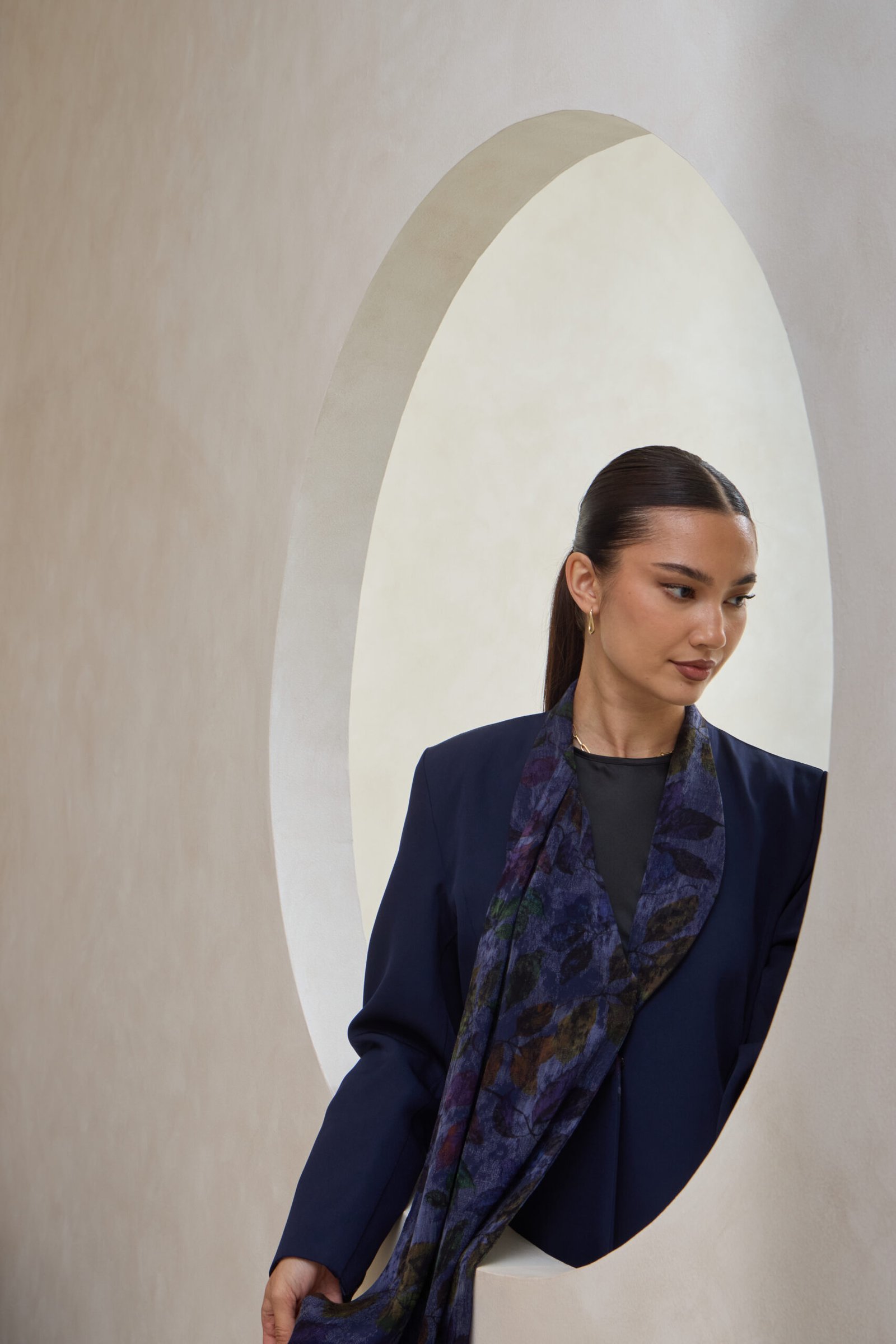 An abaya that blends the refinement of a blazer with the elegance of flowing details. Crafted in deep navy to create a calm yet luxurious presence, it comes with a distinctive scarf featuring a rich dark-toned pattern that drapes lightly, adding a refined artistic dimension to the design.