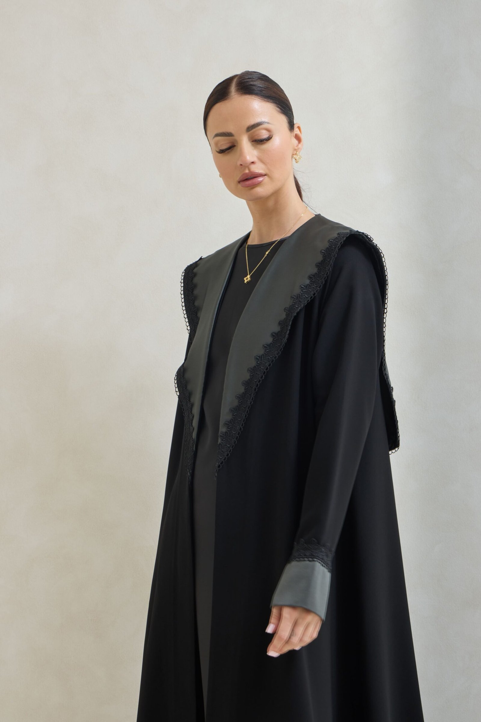 A black abaya with an innovative touch that blends luxury and calm in an unconventional style.