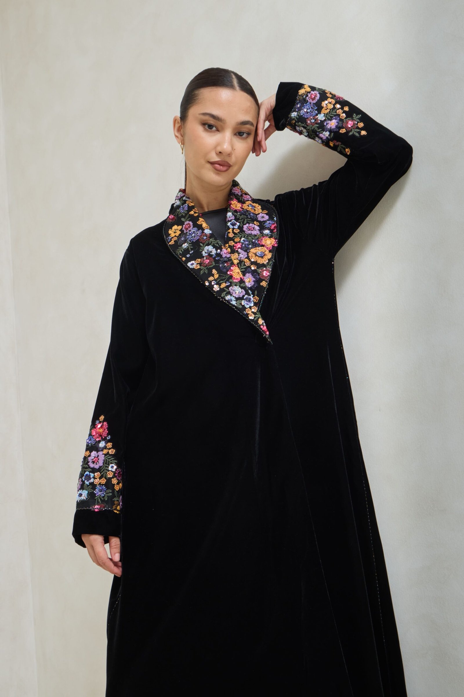 A luxurious abaya made of soft black velvet, exuding femininity through its richly colored embroidery, creating a refined contrast between the depth of black and the vibrancy of the colors. The design blends classic luxury with a modern artistic touch, ensuring a captivating presence at every occasion. A distinctive piece for any woman seeking a look that is strong, delicate, and full of refined details.