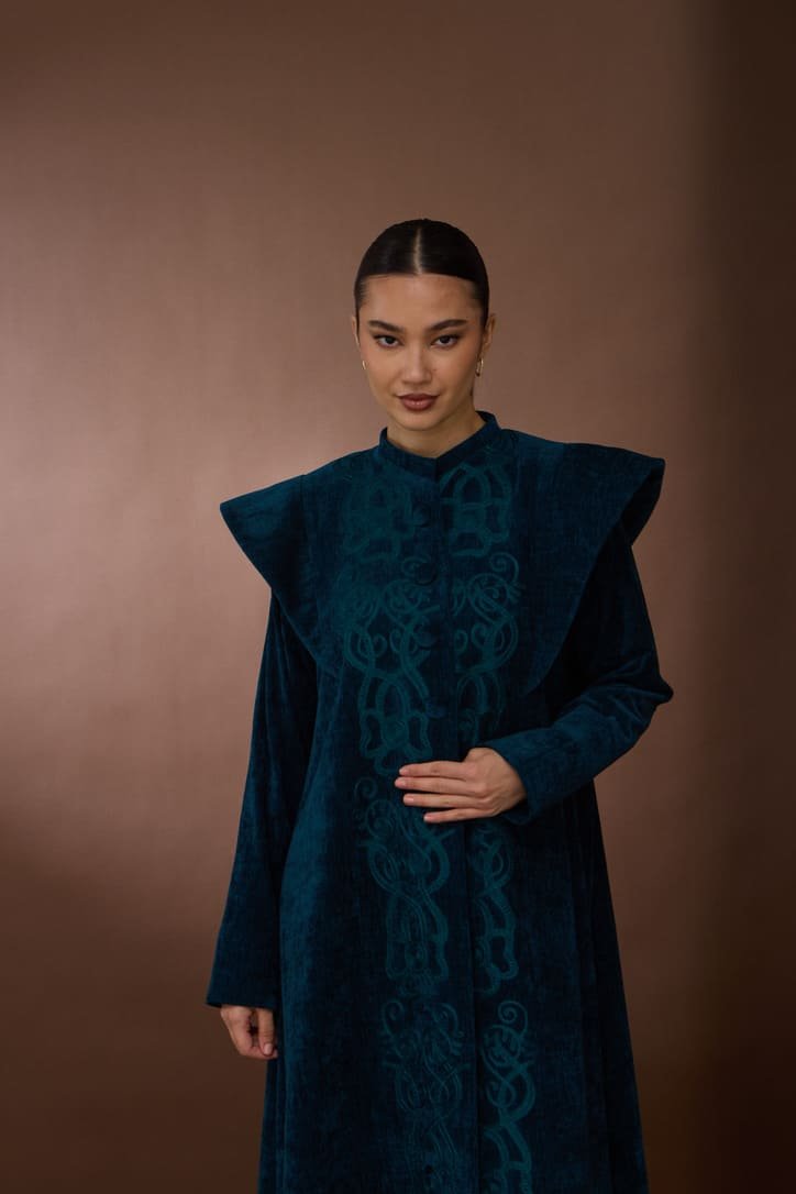 An abaya made of luxurious velvety suede, featuring a design full of elegance and distinction. It boasts a soft texture and refined appearance, adorned with artistic embroidery that adds depth and allure. The shoulders are designed to highlight the opulence of the cut, giving you a striking, regal presence. An ideal choice for any woman seeking a sophisticated look that combines luxury with a contemporary touch.
