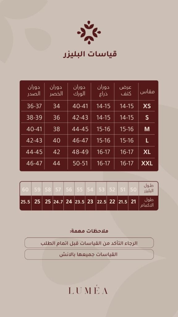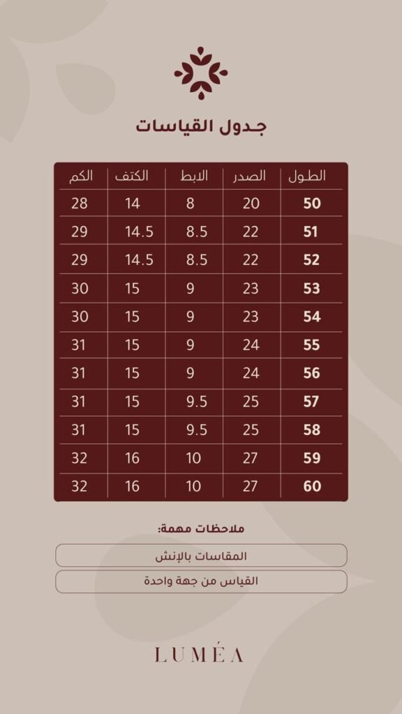 لأن راحتكِ تبدأ من المقاس الصحيح، حرصنا في Lumea Line على توفير دليل تفصيلي للقياسات. يرجى مراجعة الجداول أدناه بدقة قبل إتمام الطلب لضمان الحصول على إطلالة مثالية ومريحة.”